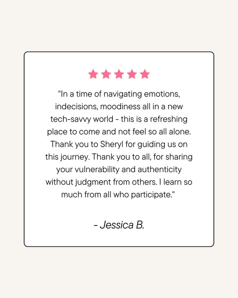 You will have the opportunity to join us each month for our live meetup led by Sheryl to talk about all things motherhood—from the everyday moments to the tough stuff. You’ll leave feeling encouraged and reassured, and with something valuable, you can apply right away. It’s a space to connect with your “me too” mom tribe, where everyone knows they belong.
