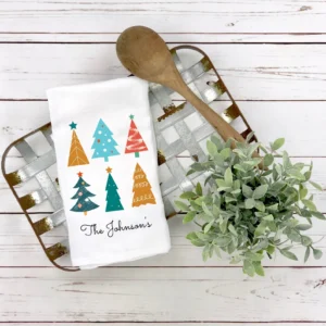 This festive Christmas Tree Towel with a watercolor design is a holiday season showstopper! Personalize this special Christmas tree tea towel with your name, city, or three-letter monogram. A great hostess gift idea for Christmas.
